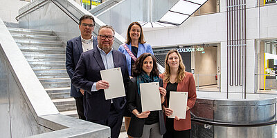 Im InnovationSPIN in Lemgo hat Regierungspräsidentin Anna Katharina Bölling die Förderbescheide für das Projekt KIT.OWL an Prof. Dr. Jürgen Jasperneite (Fraunhofer IOSB-INA), Björn Böker (OWL GmbH), Nissrin Heymann (Fraunhofer IOSB-INA) und Verena Dondorf (Fraunhofer IEM) überreicht.
