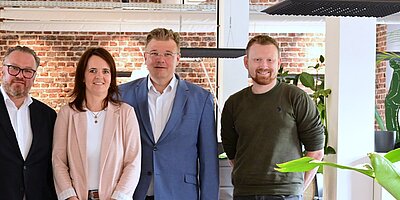 Auf dem Foto: Startklar im Mindener Gründungszentrum StartMiUP (v. l.): Björn Böker (OWL GmbH), Catharina Behl (Kreis Minden-Lübbecke), Nico Clasing (Stadtsparkasse Rahden, Sprecher der Jury) und Vorjahressieger Tobias Rebert (Tentris).