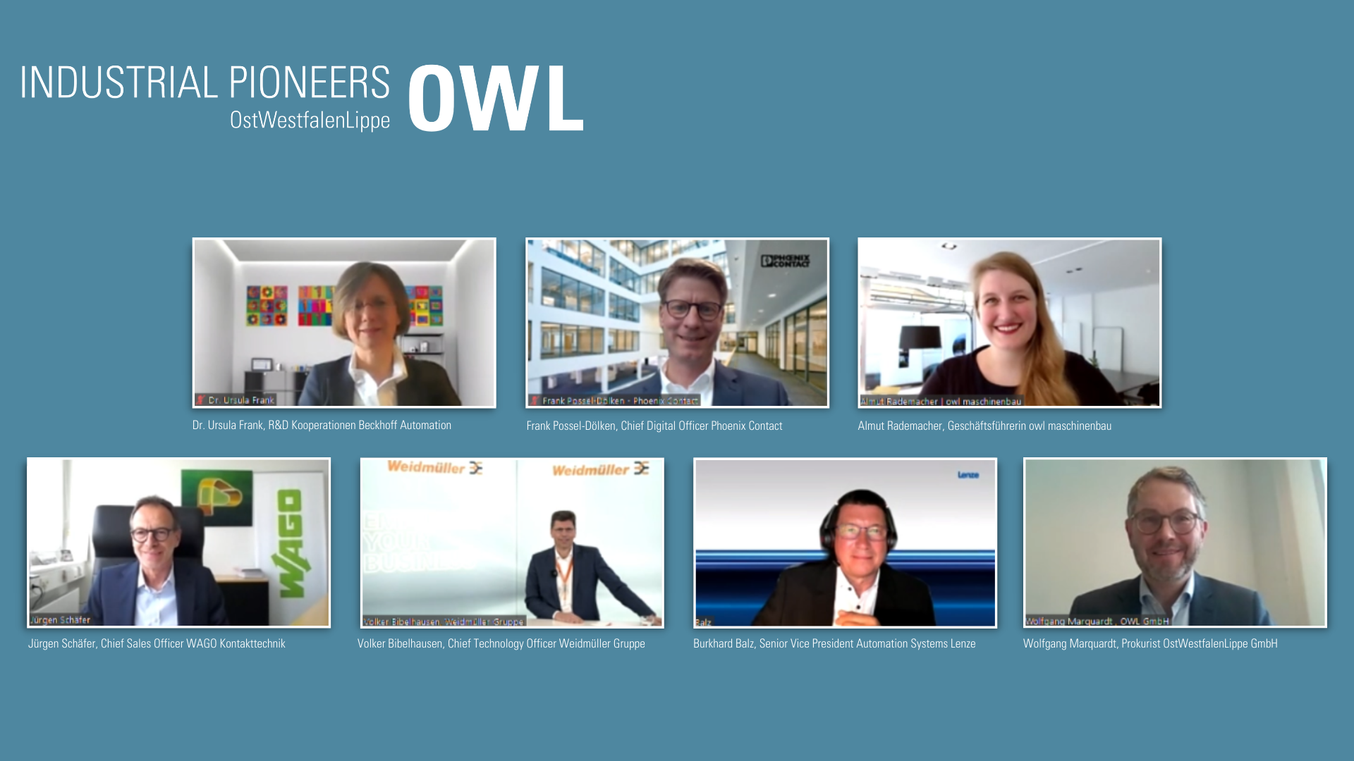 Die Unternehmen der Automatisierungsindustrie in OWL sind ein wichtiger Treiber für die Industrie von morgen. Die Weltmarktführer Beckhoff, Lenze, Phoenix Contact, Wago und Weidmüller bieten zahlreiche Lösungen für Industrie 4.0 und KI im Mittelstand. Sie sind Partner in vielen regionalen Initiativen wie dem Spitzencluster it´s OWL und owl maschinenbau – und auch der virtuellen Innovationsschau Industrial Pioneers OWL. Bei der Eröffnung nahmen Vertreterinnen und Vertreter aus der Geschäftsleitung der Unternehmen eine Standortbestimmung vor und diskutierten Handlungsempfehlungen und Erfolgsrezepte.