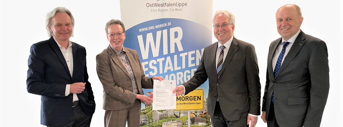 Freuen sich über den Turbo für die Digitale Zukunft von OWL (v. l.): Herbert Weber, Geschäftsführer OWL GmbH, Regierungspräsidentin Marianne Thomann-Stahl, Landrat Jürgen Müller, stellvertretender Vorsitzender der Gesellschafterversammlung der OWL GmbH und Christoph Rüther, Landrat Paderborn.