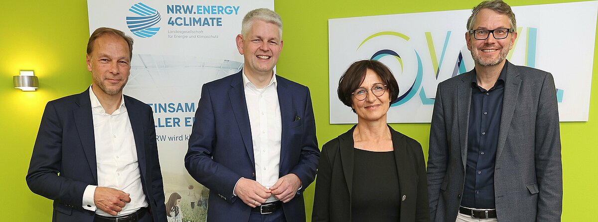 Den offiziellen Startschuss für das Regionalbüro Bielefeld gaben (v.l.): Ulf C. Reichardt, Vorsitzender der Geschäftsführung E4C, Christoph Dammermann, Staatssekretär im Wirtschafts- und Energieministerium, NRW.Klimanetzwerkerin Petra Schepsmeier und Wolfgang Marquardt, Prokurist und Leitung Regionalentwicklung OWL GmbH.
