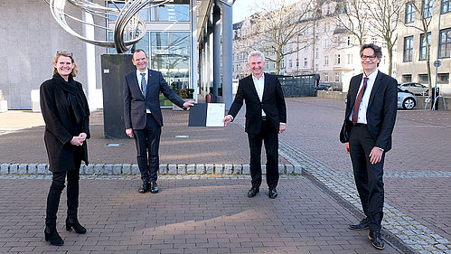 V.l. Judith Pirscher (Regierungspräsidentin im Regierungsbezirk Detmold), Prof. Dr. Jürgen Krahl (Präsident der TH OWL), Prof. Dr. Andreas Pinkwart (Minister für Wirtschaft, Innovation, Digitalisierung und Energie des Landes NRW), Prof. Dr. René Fahr (Vizepräsident der Universität Paderborn für Wissens- und Technologietransfer) | Bild: MWIDE NRW/M. Sassenscheidt