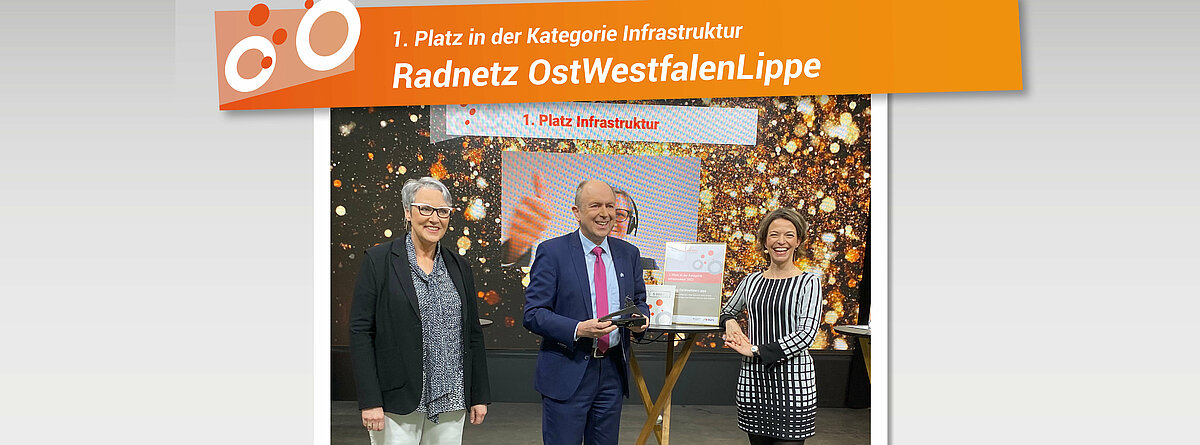 Das Infrastrukturkonzept Radnetz OWL wurde mit dem 22. Deutschen Fahrradpreis ausgezeichnet. Dies gab die Jury im Rahmen der feierlichen Preisverleihung beim AGFS-Kongress zum Fahrrad- und Nahmobilitätsgesetz heute bekannt. Beworben hatten sich 128 Projekte um die renommierte Auszeichnung des Bundesministeriums für Digitales und Verkehr und der Arbeitsgemeinschaft fußgänger- und fahrradfreundlicher Städte, Gemeinden und Kreise in NRW e.V. Mit der Auszeichnung verbunden ist ein Preisgeld von 5.000 € und eine Bronze-Fahrradtrophäe.