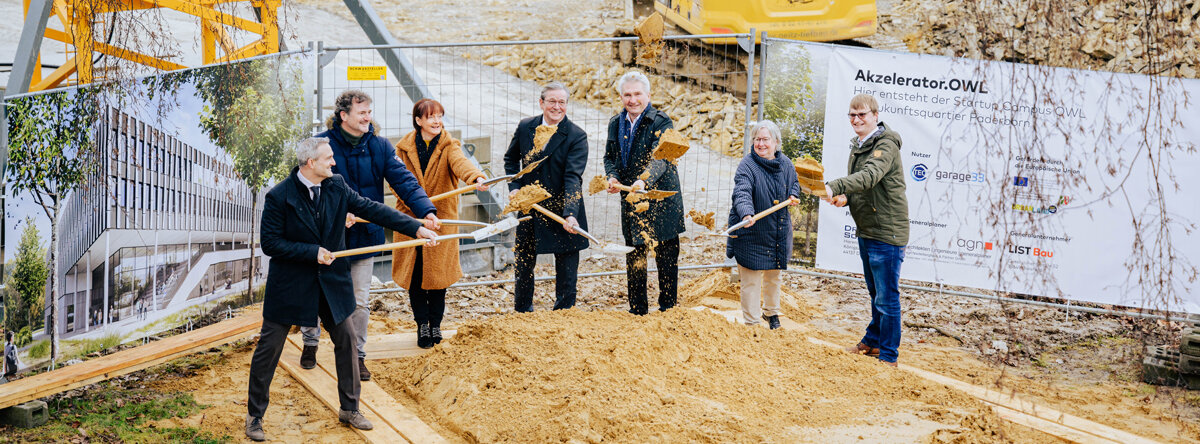 Den offiziellen Spatenstich für den Akzelerator.OWL auf dem Gelände der Barker Barraks in Paderborn führten sie gemeinsam durch: Rene Konrad (Geschäftsführer List Bau Bielefeld), Prof. Dr. Rüdiger Kabst, Regierungsvizepräsidentin Anke Recklies, Bürgermeister Michael Dreier, Minister Prof. Dr. Andreas Pinkwart, Vizepräsidentin Simone Probst (Universität Paderborn) und Prof. Dr. Sebastian Vogt.