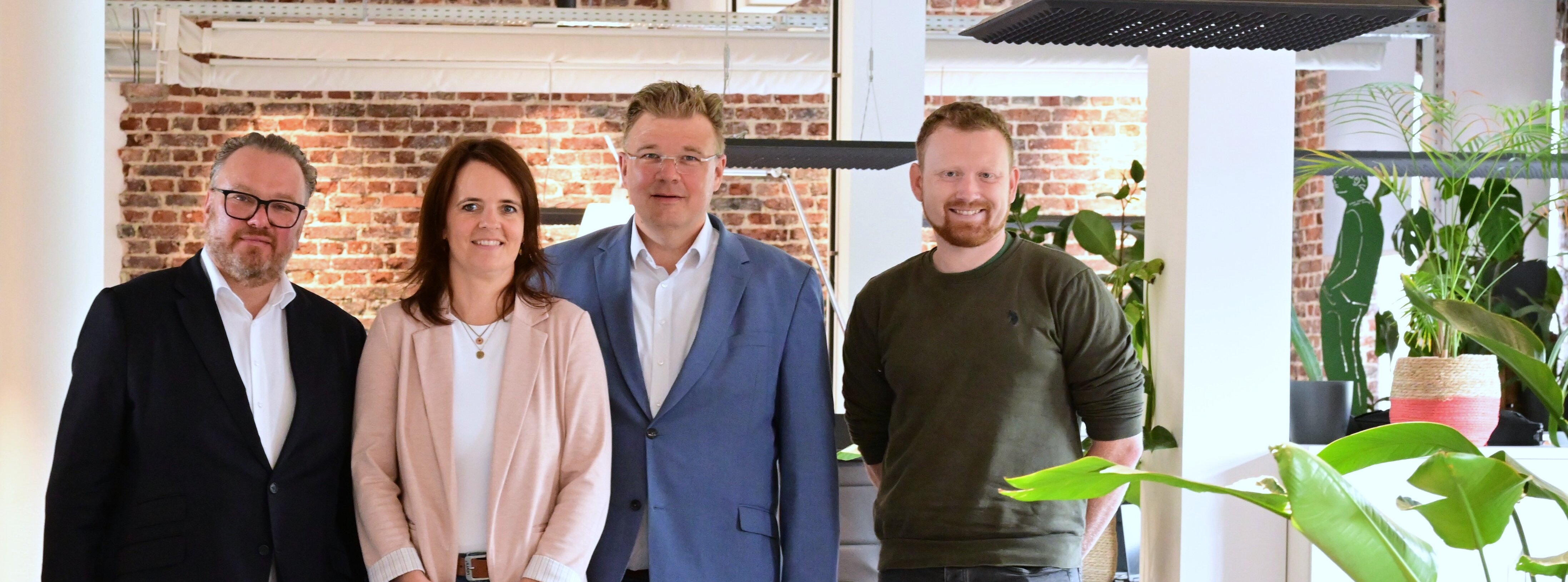 Auf dem Foto: Startklar im Mindener Gründungszentrum StartMiUP (v. l.): Björn Böker (OWL GmbH), Catharina Behl (Kreis Minden-Lübbecke), Nico Clasing (Stadtsparkasse Rahden, Sprecher der Jury) und Vorjahressieger Tobias Rebert (Tentris).